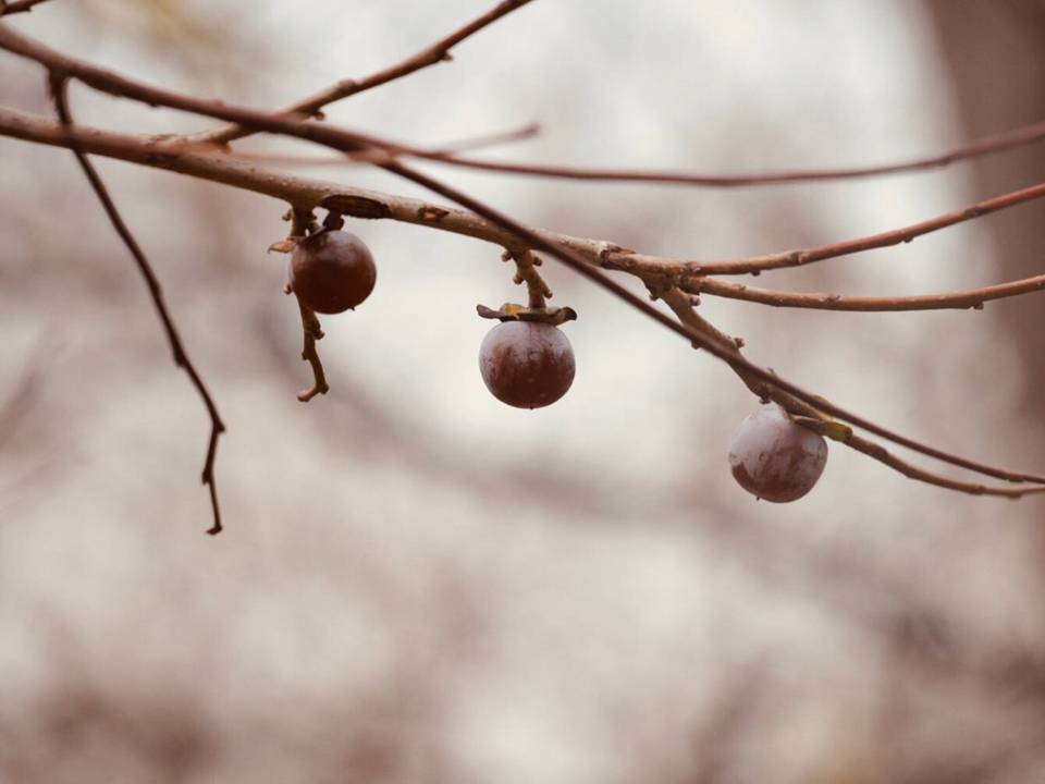 낙엽이 수북히 쌓인 숲길, 앙상한 가지에 억지로 매달린 듯한 고욤이, 마음을 아스라한 추억 저편으로 옮깁니다.
