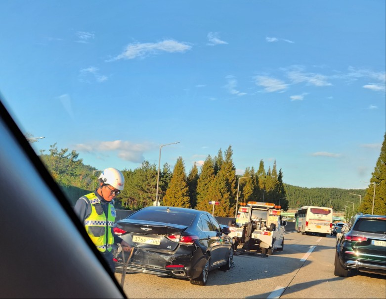○진교 -완사 고속도로상 에 4중 추돌사고로 심하게 차량 파손 견인됨(안전사고 유의) * 주말 남해안 고속도로 교통정체