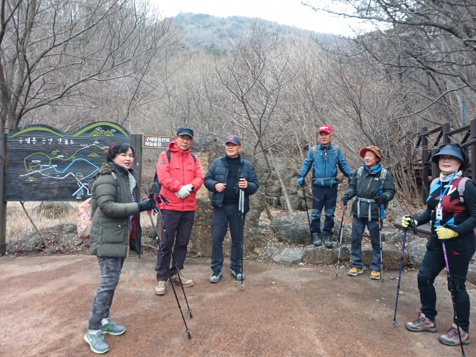 사무실 -> 하동솔밭오리(하동) ->구재봉휴양림주차장-> 휴양림 계곡둘레길->비오름입구->구재봉둘레길-> 구재봉정상(왕복 2시간30분소요)-> 구재봉휴양림 주차장